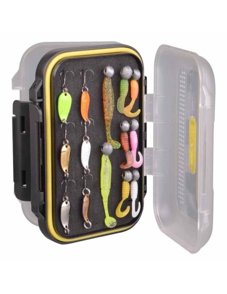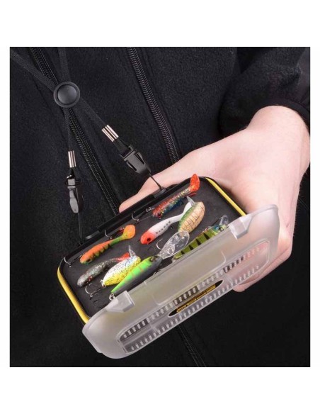 Un gran porta objetos de doble cara con espuma EVA para guardar micro señuelos, cabezas plomadas, anzuelos, triples, etc. Equipado con una correa para el cuello para un acceso rápido, pero también porque no tienes que llevar ningún otro equipaje.