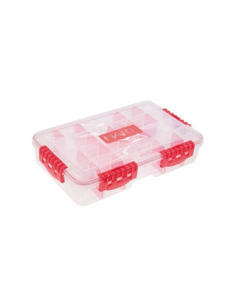 Caja Hart fabricada en plástico de alta calidad y muy resistente, con compartimentos desmontables y ajustables para transportar nuestros accesorios de pesca (emerillones, plomos, grapas, etc), o también señuelos como vinilos , etc.