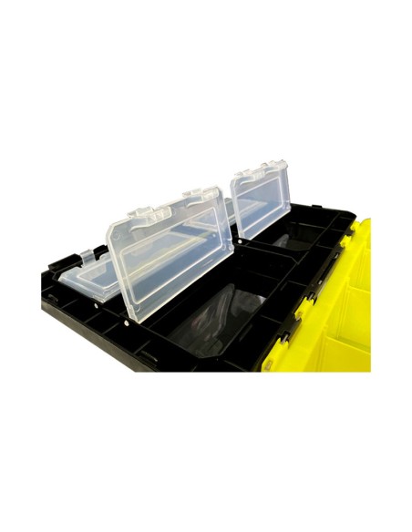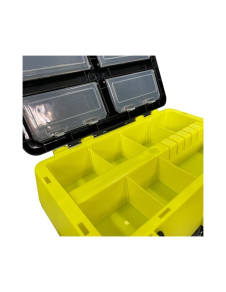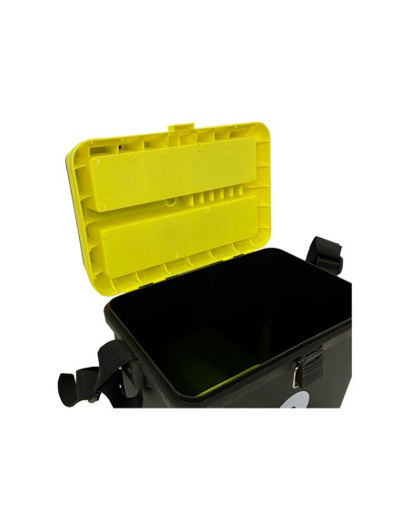 Su tapa superior esta dotada de clasificadores y huecos para el transporte de plomos por ejemplo. Podemos sentarnos en el sin miedo a que se rompa y su cavidad interior diáfana, nos permitirá llevar nuestros carretes, bobinas y accesorios.