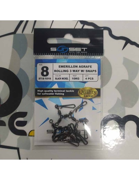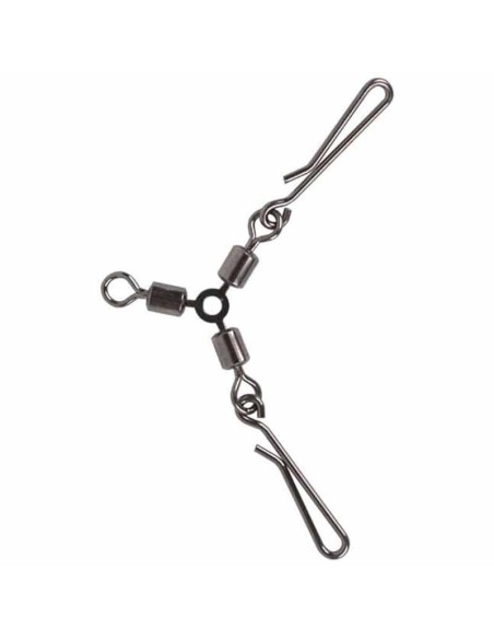 Rolling de 3 vías con doble mosquetón de liberación rápida específicos para la pesca de sepias y calamares. Diseñado para poder sujetar el plomo a la potera del calamar. También se pueden utilizar para sujetar el plomo y otros sistemas de pesca con cebo natural o artificial que requieren una liberación rápida del plomo.