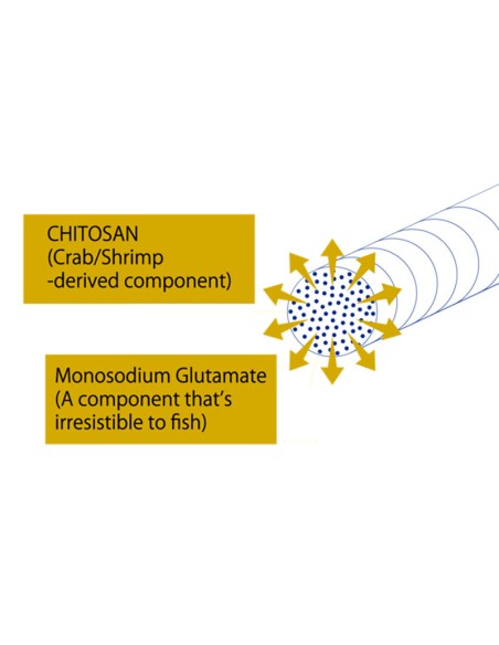 Contiene un gran componente atractivo para los peces, el glutamato monosódico, que mantiene su atención durante más tiempo y puede ser efectivo incluso en días difíciles. También contiene abundante quitosano, un componente derivado del cangrejo y el camarón, y está hecho de un nuevo material suave que atrae picadas profundas. Su aroma y material se desarrollaron en las instalaciones de incubación de la Universidad de Ryukoku.