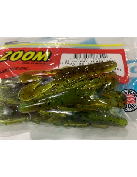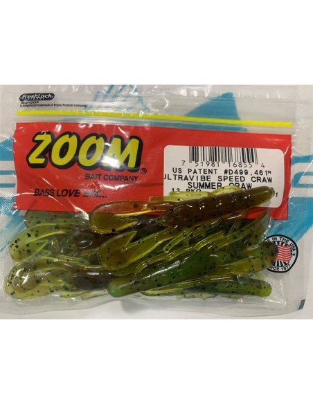 El Ultravibe Speed Craw de ZOOM es uno de los vinilos más utilizados por los pescadores de black bass. Este cangrejo está armado con dos pinzas tipo Hoz, y a su cuerpo cónico se le han unido algunos apéndices en forma de patas. Con este cangrejo podemos utilizar multitud de técnicas. Desde utilizarlo sin plomo, con medio plomo, o con mucho gramaje para buscar profundidad y una pesca más picada. Podemos utilizarlo también para complementar a nuestros jigs y micro jigs, teniendo cuidado con la combinación de colores y sobre todo con la longitud de los pelos o barbas de los jigs, ya que al ser un vinilo corto, no deben superarlo, ya que evitarían que el vinilo trasmitiese las vibraciones oportunas al agua, ocultando también su presencia al pez. Tamaño 3 1/2 " Blister de 12 Uds